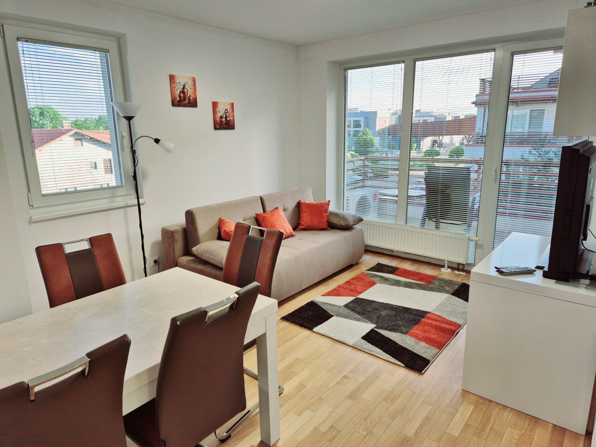 Apartma obsega ločeno spalnica z zakonsko posteljo in eno raztegljivo ležišči za dve osebi v bivalnem prostoru. V popolnoma opremljeni kuhinji boste skuhali vse: od kave in čaja, do popolnega kosila. Svežega zraka se lahko nadihate na pokritem balkonu, kjer vam udobna sedežna garnitura nudi prostor za sprostitev in počitek.